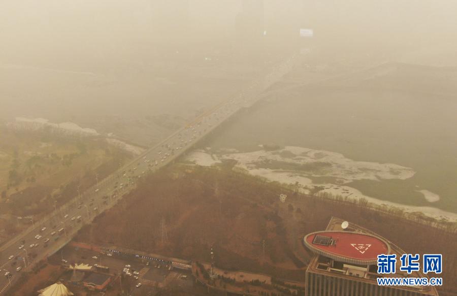 這是3月15日拍攝的遼寧省沈陽市渾河橋(無人機照片)。當日,我國北方多地出現沙塵天氣。新華社記者 楊青 攝
