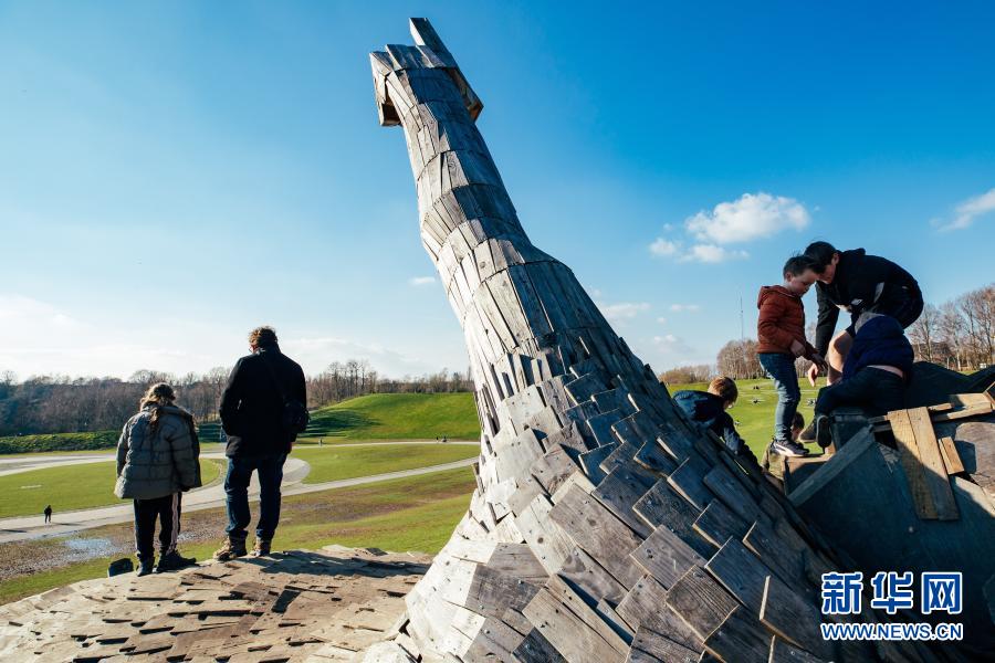 3月20日,人們在比利時博姆市的德舒爾森林公園和一座“巨人”雕塑“玩?!?。新華社記者 張鋮 攝