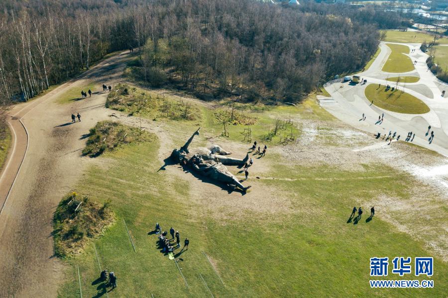 這是3月20日在比利時博姆市的德舒爾森林公園拍攝的“巨人”雕塑(無人機照片)。新華社記者 張鋮 攝