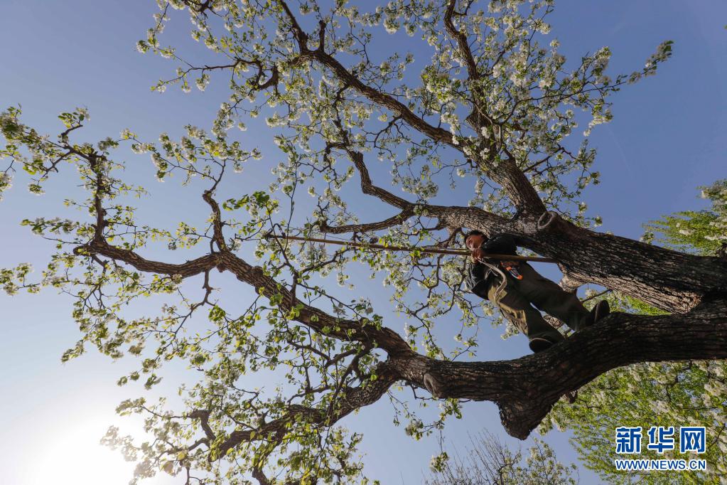 4月6日,河北唐山遵化市鐵廠鎮東平臺村的農民在果園管護梨樹。