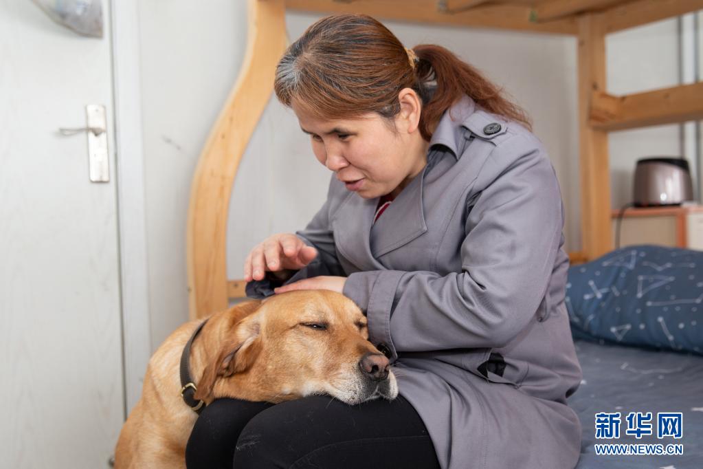 導盲犬“多多”經常會把頭放在祝愛葉腿上,祝愛葉一邊撫摸著它的頭一邊和它說說心里話(4月26日攝)。 新華社發 (張夢 攝)