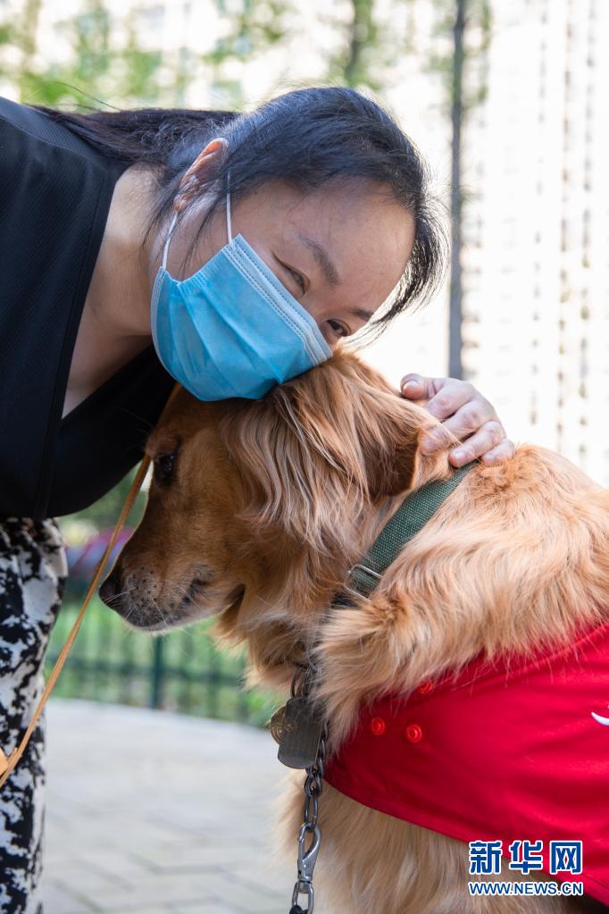 生活在南京市建鄴區的陳冬梅與導盲犬“果凍”在一起(4月4日攝)。 新華社發 (張夢 攝)