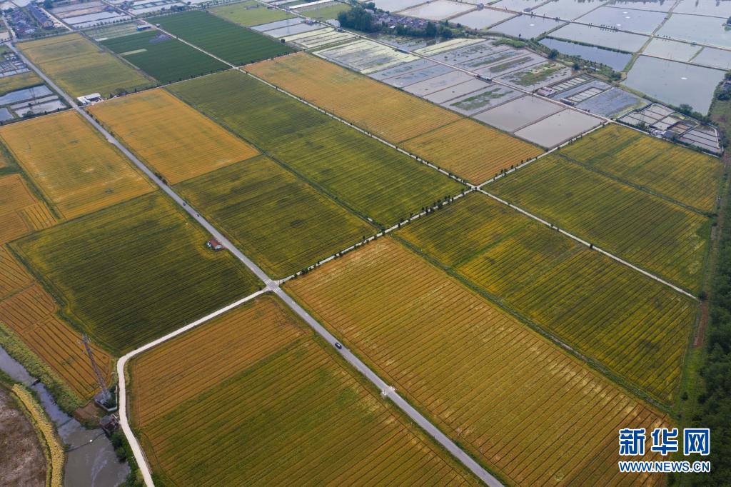 初夏時節,浙江省湖州市吳興區東林鎮萬畝田野里的金黃的小麥、綠色的桑葉、彩色的花海還有白鷺等野生鳥類等構成了一幅五彩田園的美麗景色。