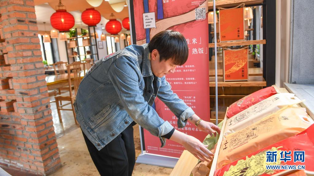 在吉林市船營區大綏河鎮,創業者曹曦將農場生產的大米擺在民宿顯眼位置進行展示(4月20日攝)。新華社記者 張楠 攝