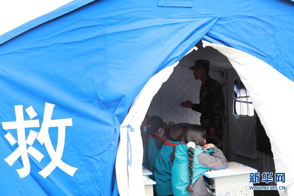 5月24日,武警青海總隊果洛支隊機動大隊排長張國睿為花石峽鎮藏文中心寄宿制小學的孩子上課。新華社記者 劉芳 攝