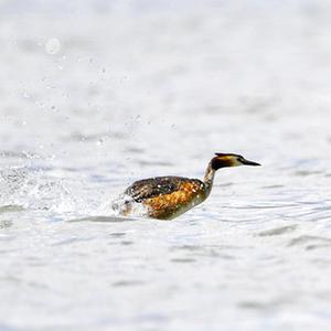 6月14日在拉魯濕地拍攝的兩只鳳頭??和一只小??(中)。夏日里,鳳頭??和小??在西藏拉薩拉魯濕地國家級自然保護區水面上嬉戲。新華社記者 張汝鋒 攝