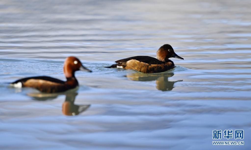 6月14日在拉魯濕地拍攝的兩只小??。夏日里,鳳頭??和小??在西藏拉薩拉魯濕地國家級自然保護區水面上嬉戲。新華社記者 張汝鋒 攝