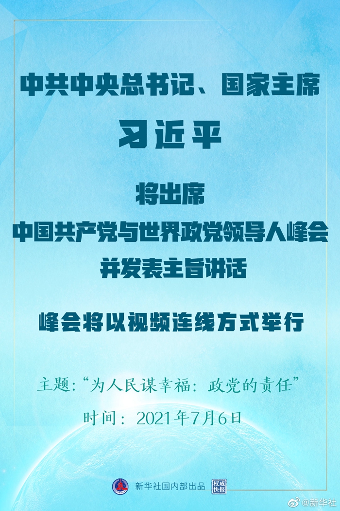 中共中央對外聯絡部發言人胡兆明5日宣布,中國共產黨與世界政黨領導人峰會將于7月6日以視頻連線方式舉行,中共中央總書記、國家主席習近平將在北京出席會議并發表主旨講話。此次會議的主題為“為人民謀幸福:政黨的責任”,160多個國家的500多位政黨和政治組織等領導人以及逾萬名政黨代表等將出席會議。