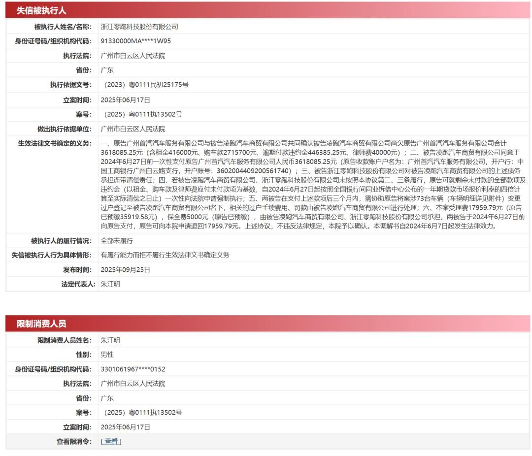 新华网北京9月28日电(记者丁峰 黄海荣)近日,中国执行信息公开网披露的一则信息将月前市值突破千亿市值的零跑汽车推至舆论风口浪尖。9月25日,广州市白云区人民法院将浙江零跑科技股份有限公司(零跑汽车,09863.HK)及其全资子公司凌跑汽车商贸有限公司(简称:凌跑汽车商贸)列为失信被执行人,案号为(2025)粤0111执13502号,执行依据文号为(2023)粤0111民初25175号。与此同时,零跑汽车创始人、董事长朱江明也因此被限制高消费。