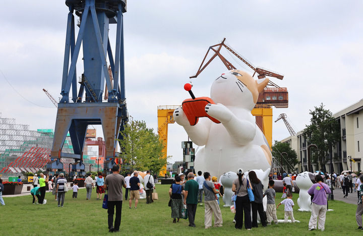 巨型塔吊下,一只近10米高的气膜猫咪手持红色遥控器仰头望天,四只小猫环绕在侧,仿佛在屏息围观这场跨越时空的“操控”……国庆中秋假期,不少旅客来到上海的新晋“顶流”复兴岛,艺术家Tango的装置艺术作品《猫的频道》吸引大家驻足打卡。