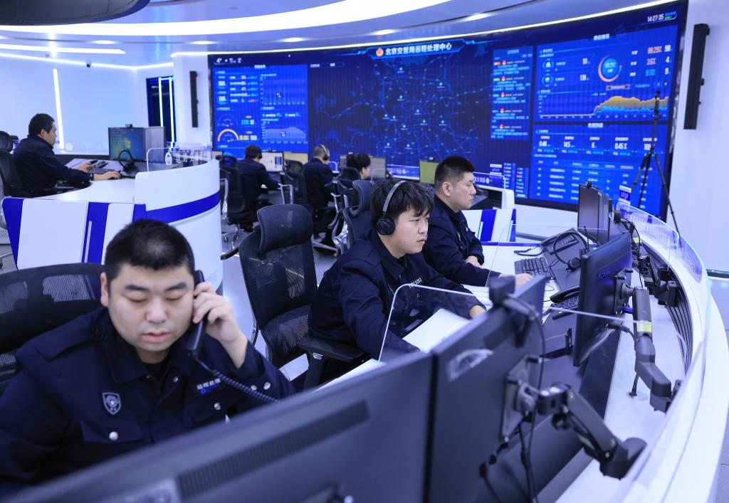 1月7日,在北京市道路交通事故警保合作远程处理中心,民警和远程处理专席人员、远程处理理赔专席人员在进行交通事故远程处理。新华社记者 邢广利 摄