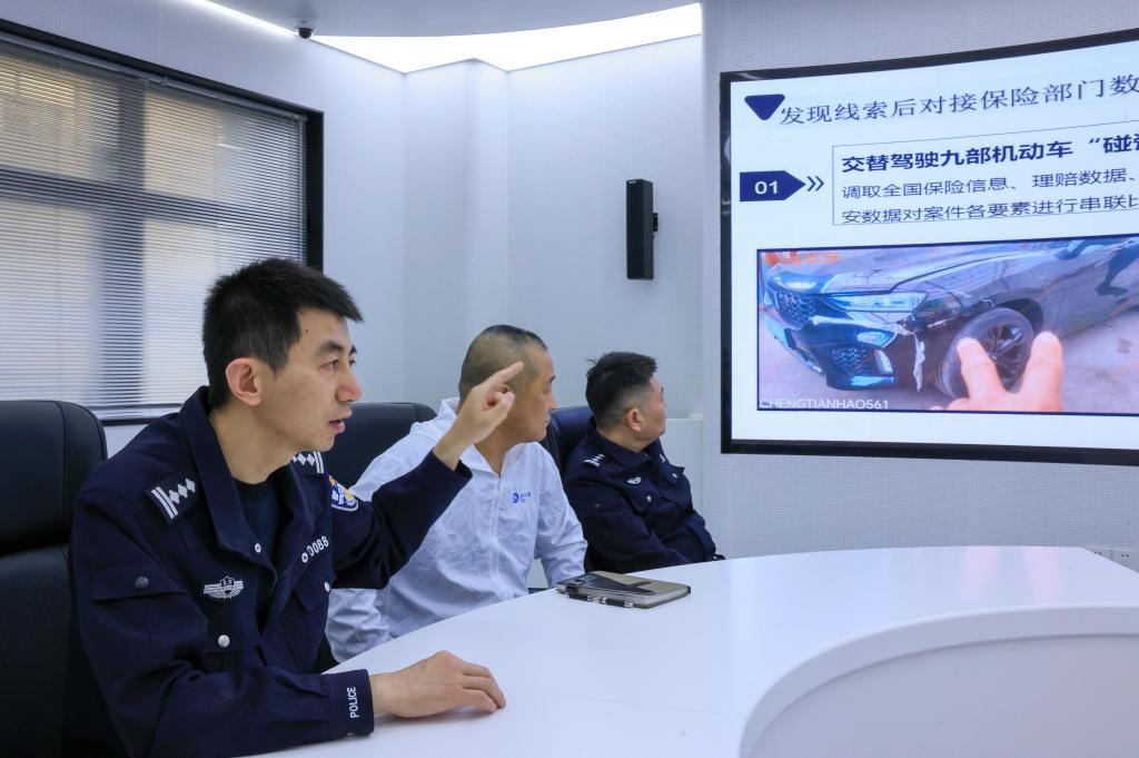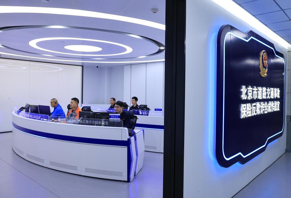 1月7日,在北京市道路交通事故警保合作远程处理中心的交通事故保险反欺诈合成作战室,民警与工作人员在分析研判有诈保嫌疑的交通事故。新华社记者 邢广利 摄