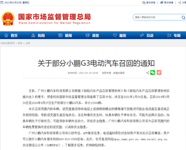 根据计划,小鹏汽车决定自2021年1月30日起,召回2019年3月29日至2020年9月27日生产的部分小鹏G3汽车,共计13399辆。