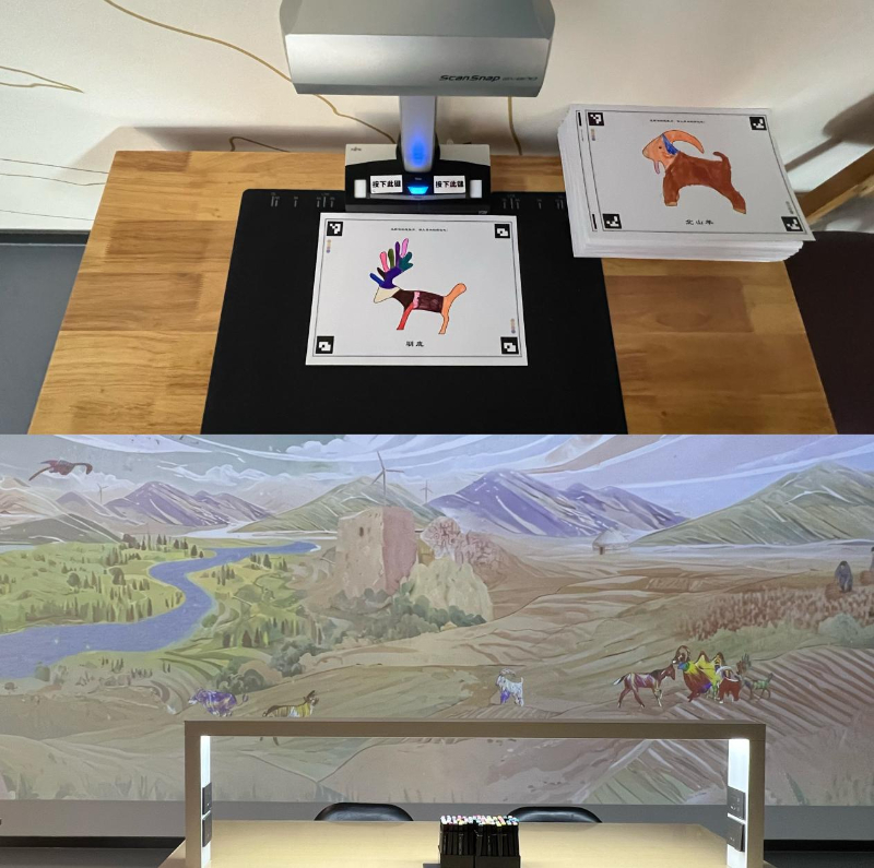 图为内蒙古博物院N探空间“灵感创作区”的黑白填涂活动,游客可将填涂后的作品扫描(上图),“映”到北疆图轴上(下图)。新华网 李世纯 摄