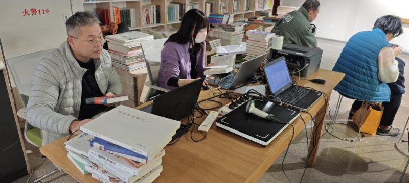 中午十二点半,图书馆馆员抵达书店,安装并调试好图书加工设备,静待读者参加新一年的现场选书活动。