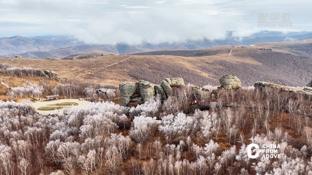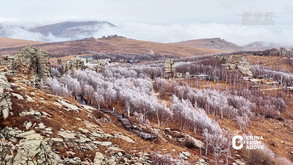 金秋十月,内蒙古自治区赤峰市克什克腾旗阿斯哈图石林迎来一场雾凇景观,为亿万年前的花岗岩群披上银装。嶙峋石峰耸出云海,琼枝玉树缀满岩隙,整片石林宛如镶满碎钻的银色秘境,在北疆的秋日里悄然铺展出一幅惊艳画卷。