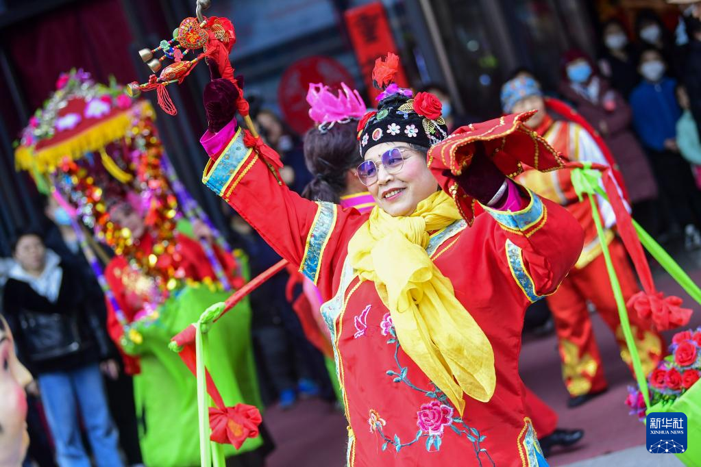 2月5日,演员在手造年货大集上表演山东大秧歌。