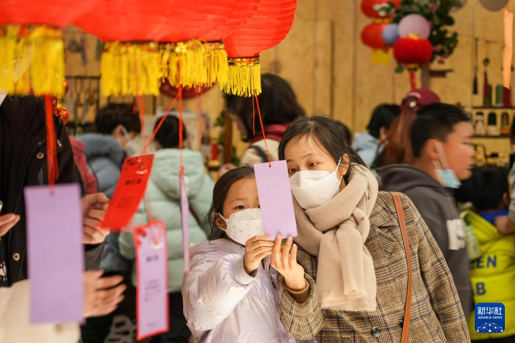 2月5日,游客在山东手造年货大集上猜灯谜。