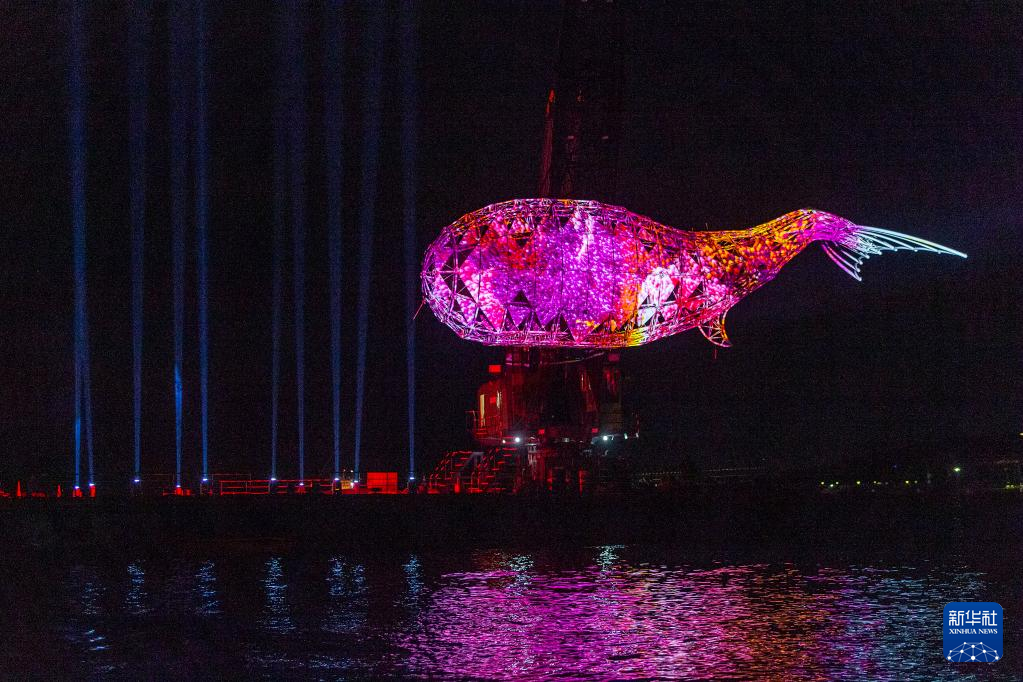 这是2月4日在希腊雅典西部的埃莱夫西斯的庆典现场拍摄的巨型机械鲸鱼。