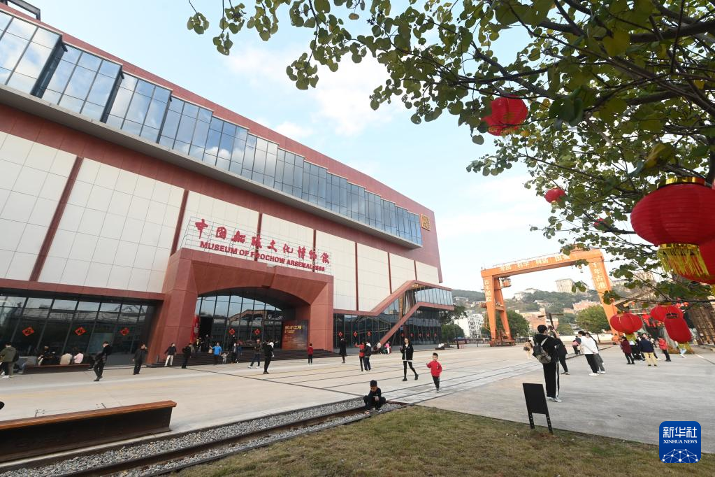 2月12日,游客在中国船政文化城核心区内的中国船政文化博物馆前游玩。
