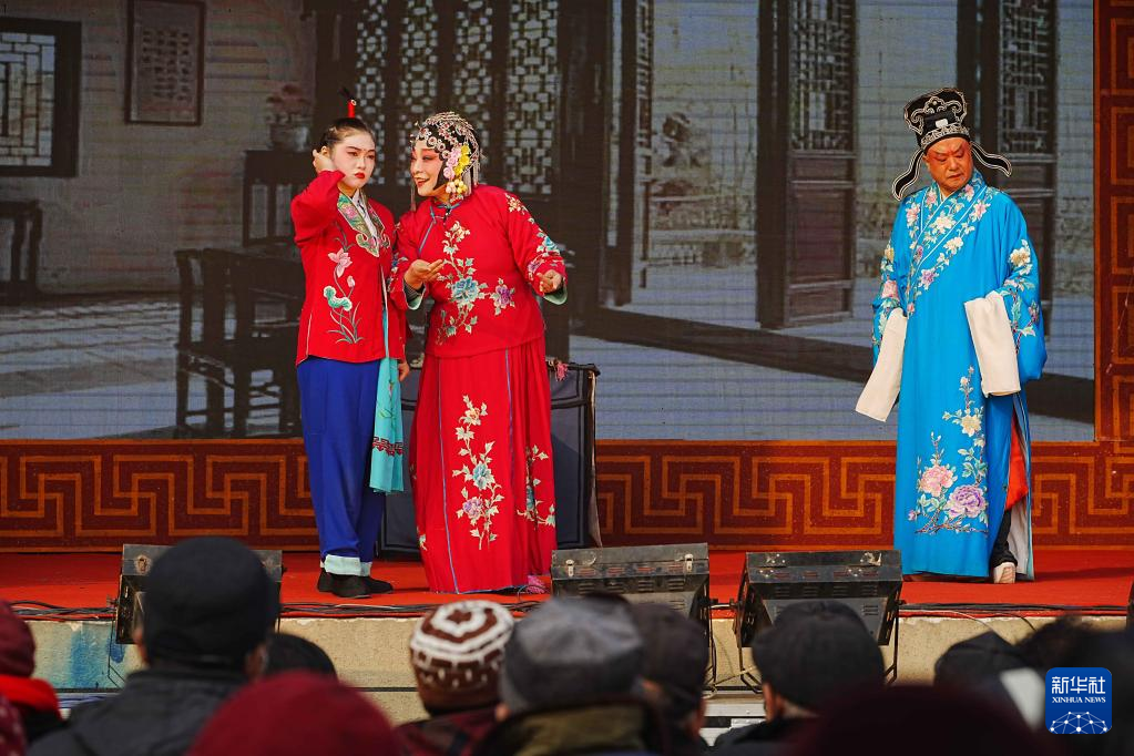 2月15日,演员在石家庄市鹿泉区南甘子村文化广场舞台演出评剧《状元与乞丐》。