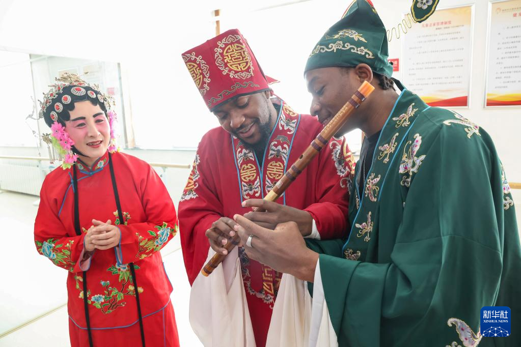 2月17日,在山东省临沂市兰山区枣园镇弦子戏非遗展厅,外国留学生在了解笛子的发声原理。