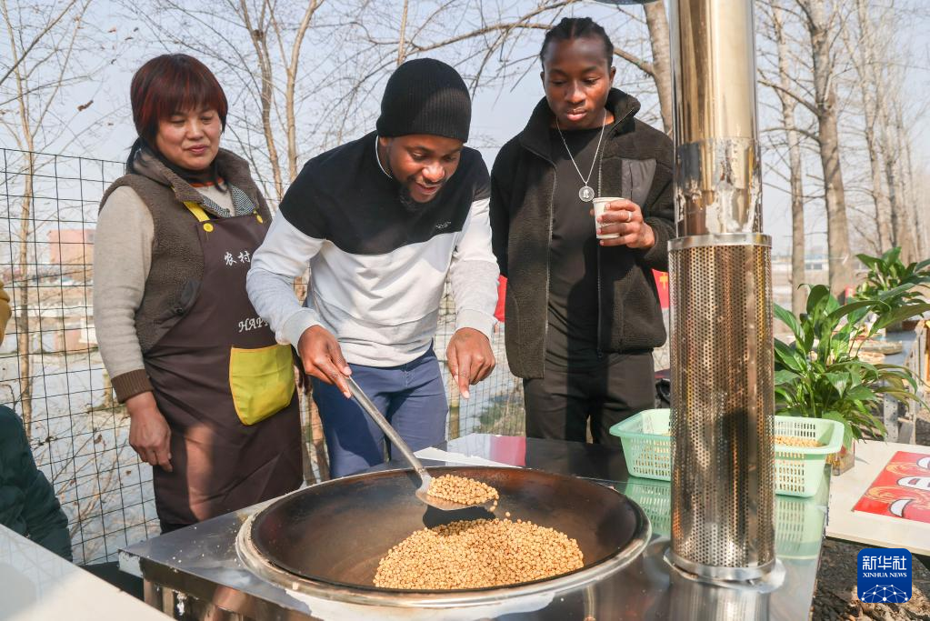 2月17日,在山东省临沂市兰山区枣园镇大枣沟头村,两名来自临沂大学的外国留学生在体验炒黄豆。
