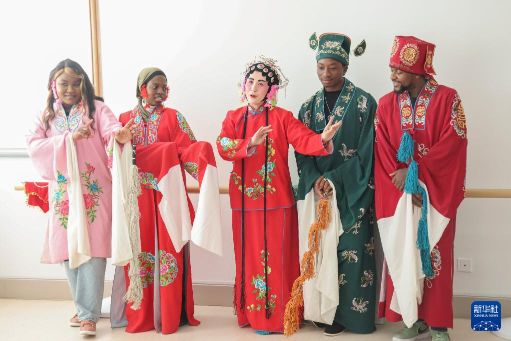 2月17日,在山东省临沂市兰山区枣园镇弦子戏非遗展厅,当地非遗传承人刘妮(左三)指导留学生体验唱弦子戏。