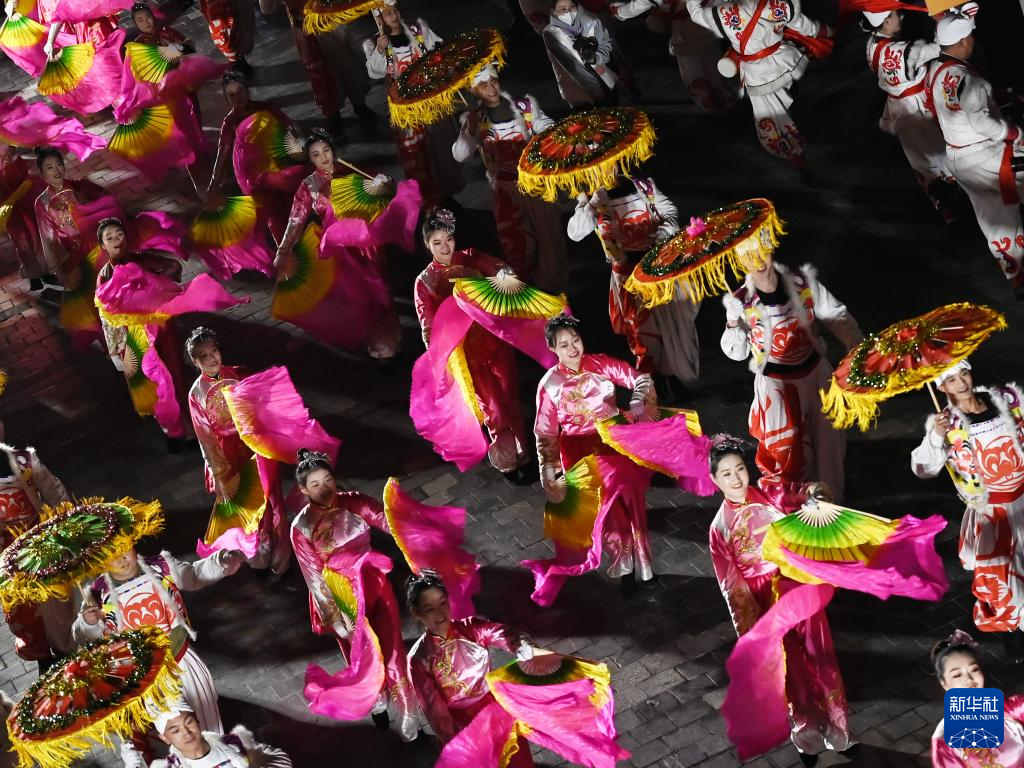 演员在榆林老街非遗大集开集仪式上表演秧歌腰鼓(2月17日摄)。