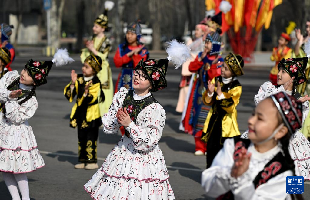 3月21日,孩子们在吉尔吉斯斯坦首都比什凯克阿拉套广场参加纳乌鲁斯节庆典表演。