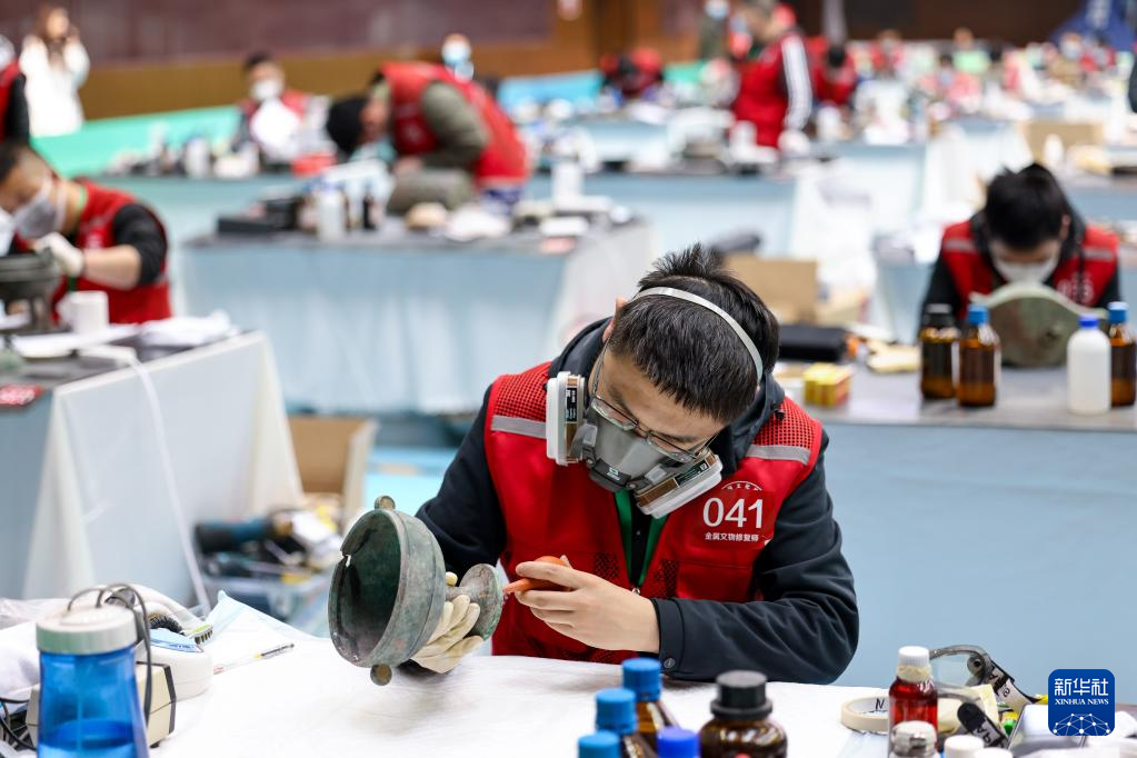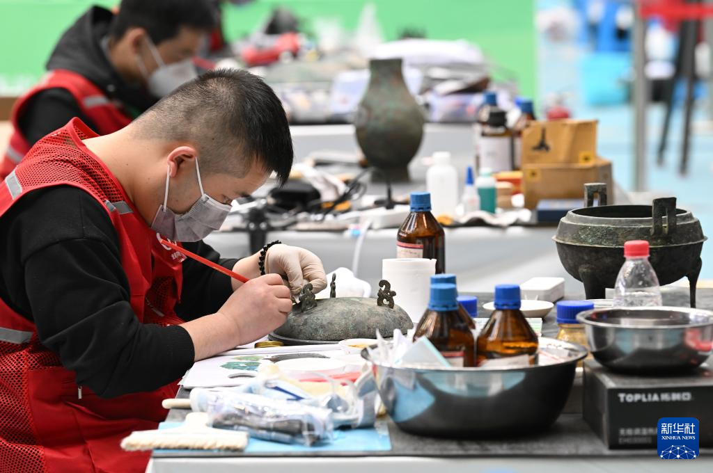 3月25日,参加金属文物修复师比赛项目的选手在现场修复文物。