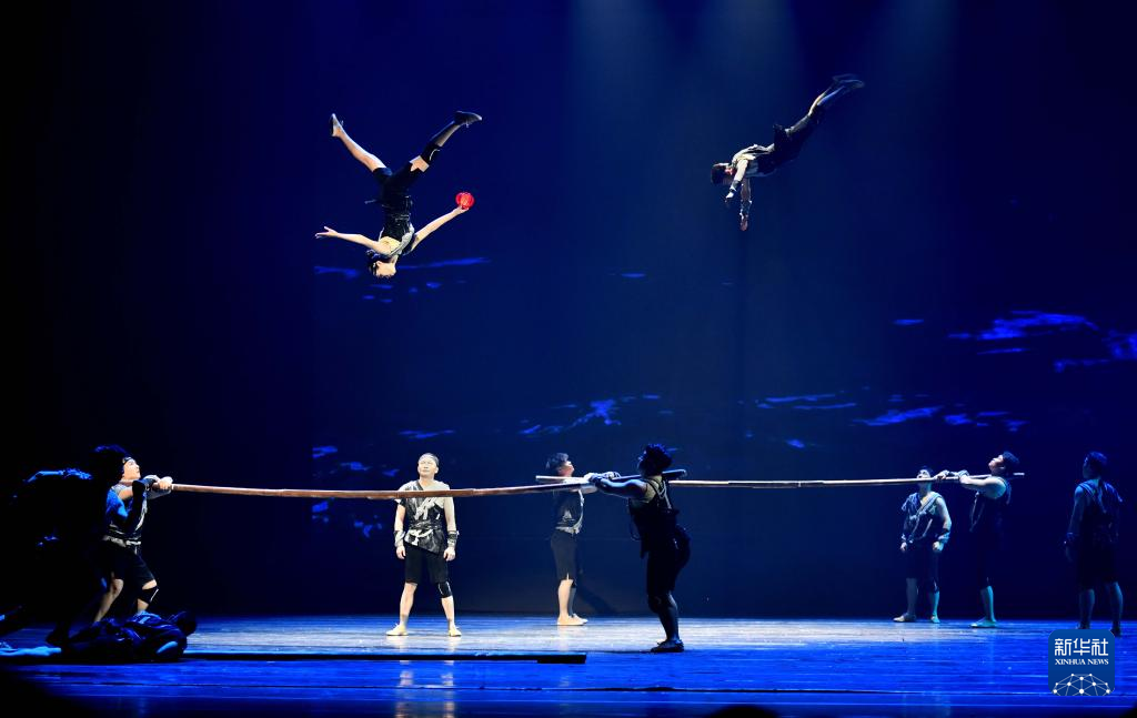 3月27日晚,在位于山东省济南市的山东剧院,演员表演杂技节目《乘帆逐浪·抖杠》。