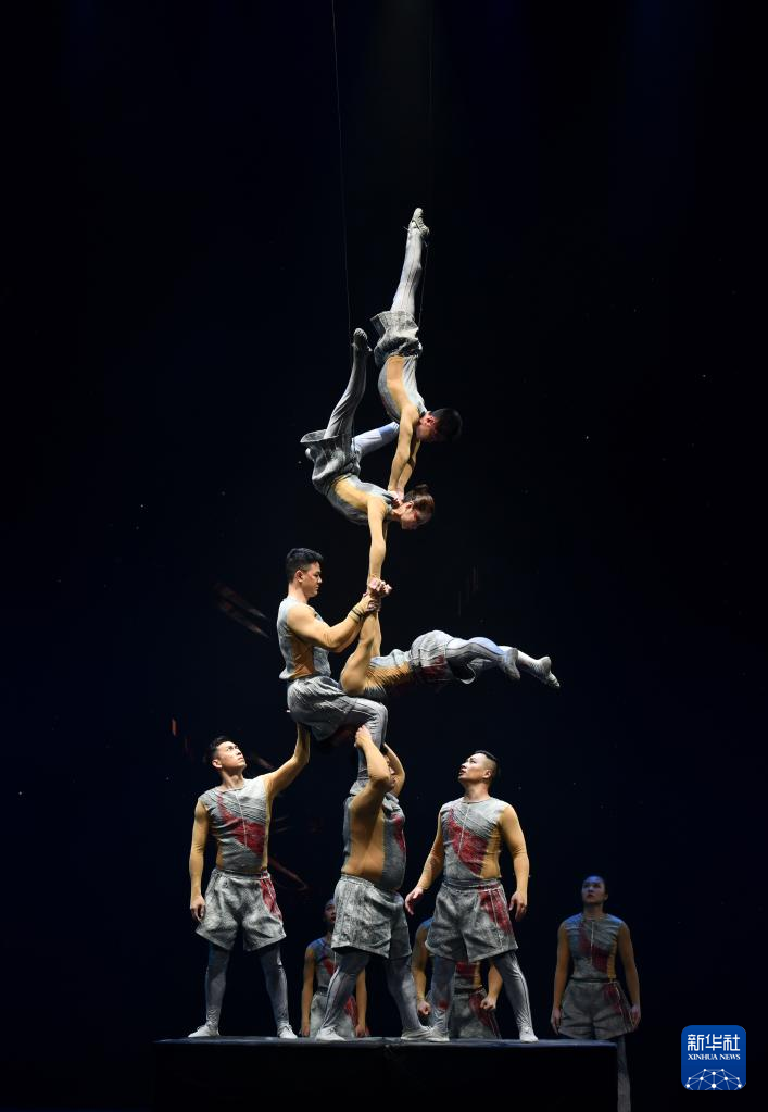 3月27日晚,在位于山东省济南市的山东剧院,演员表演杂技节目《炼·倒立技巧》。
