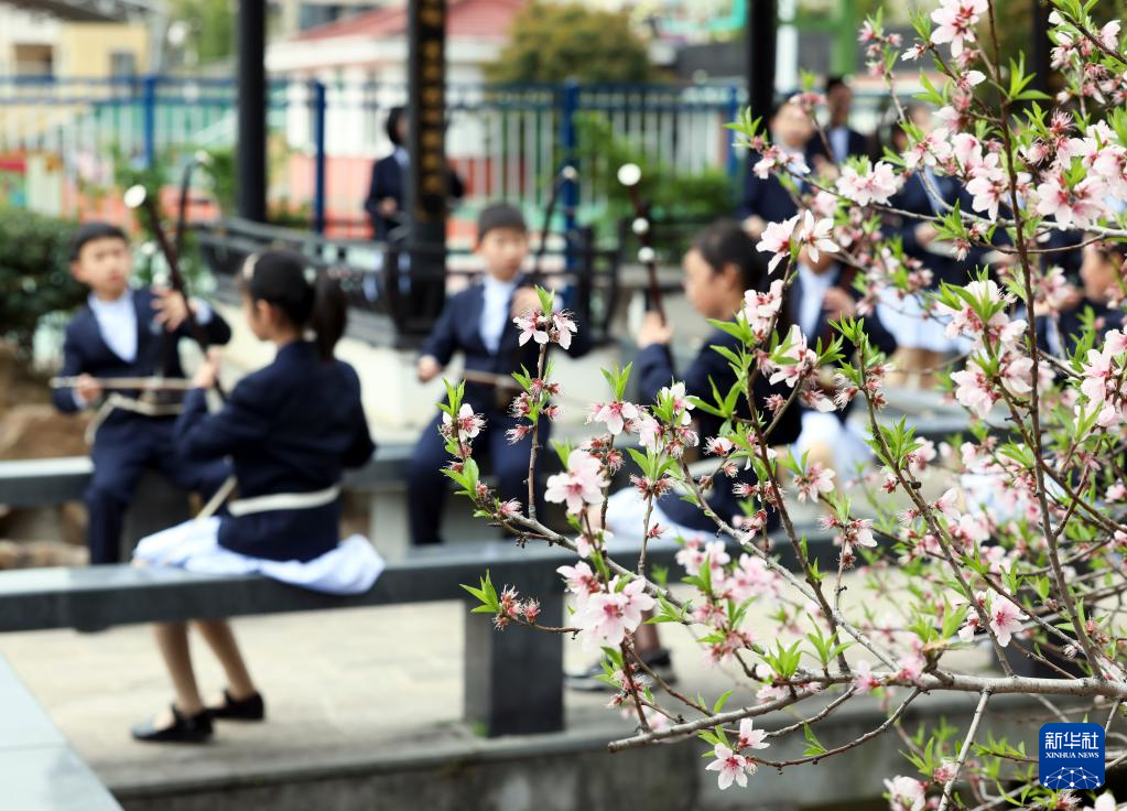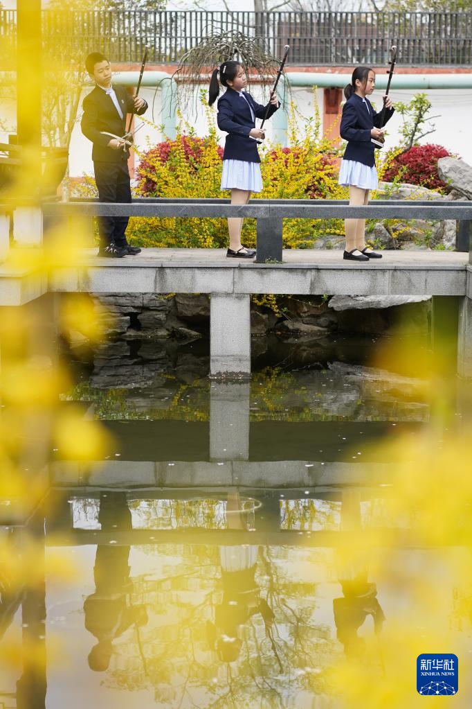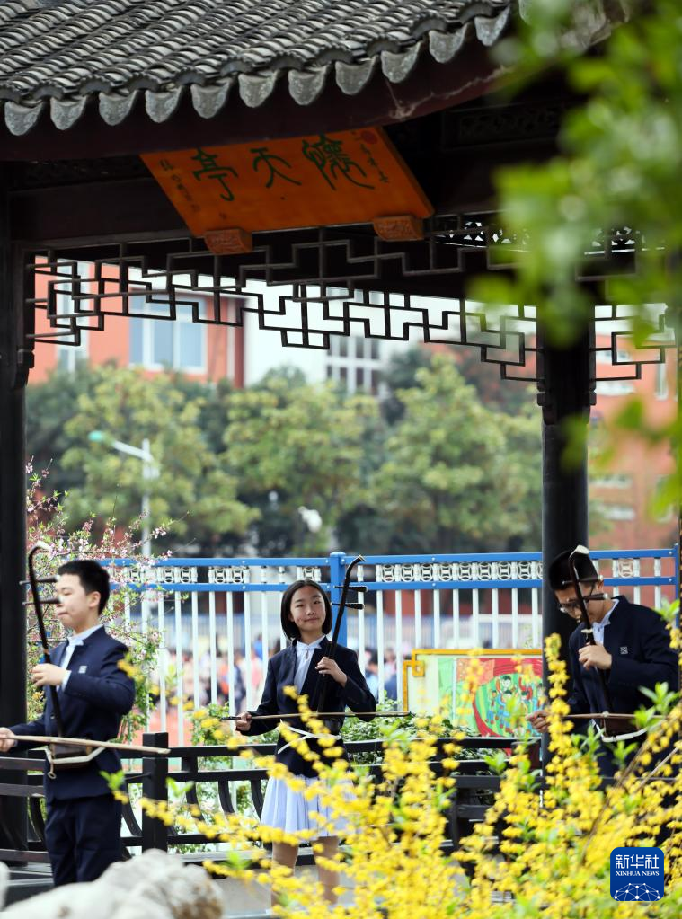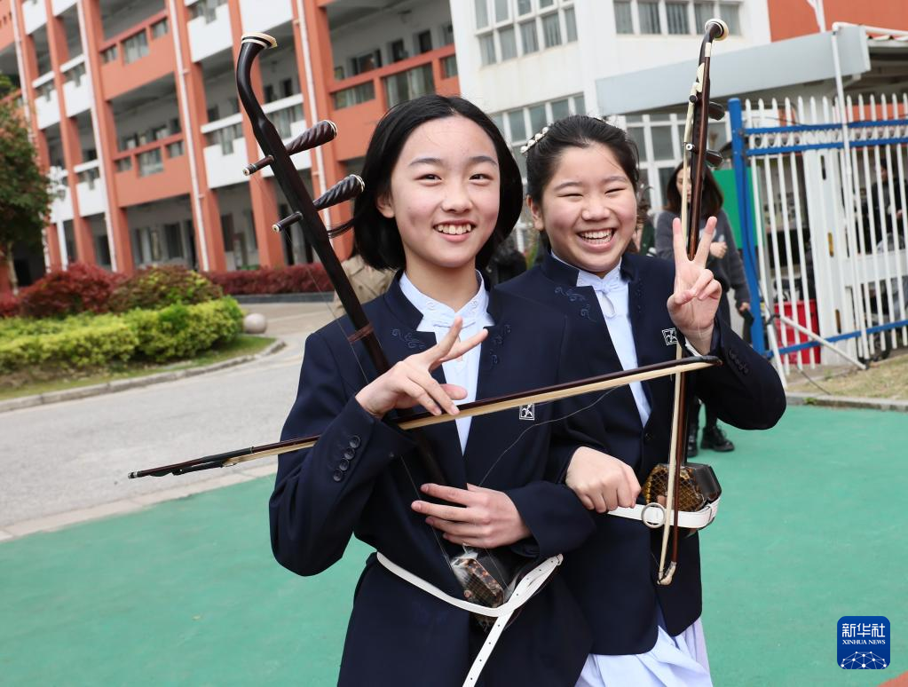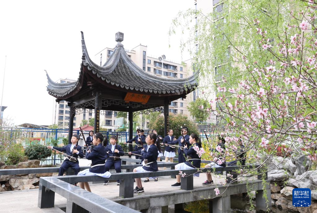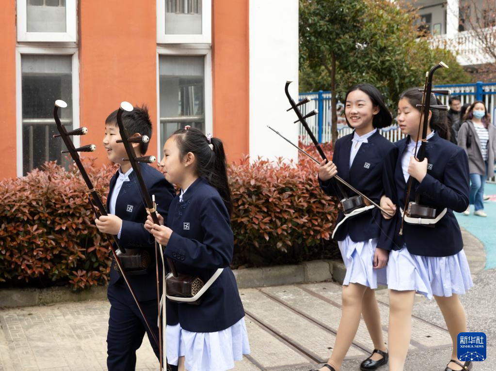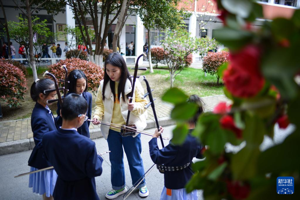 3月29日,江苏无锡梅村实验小学二胡社团学生在校园内。