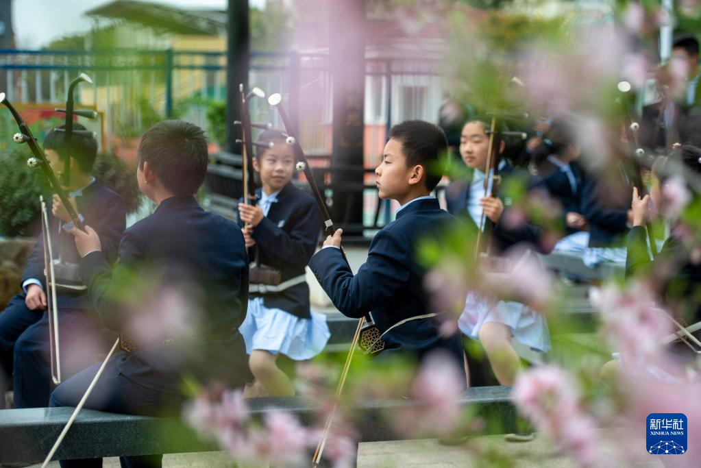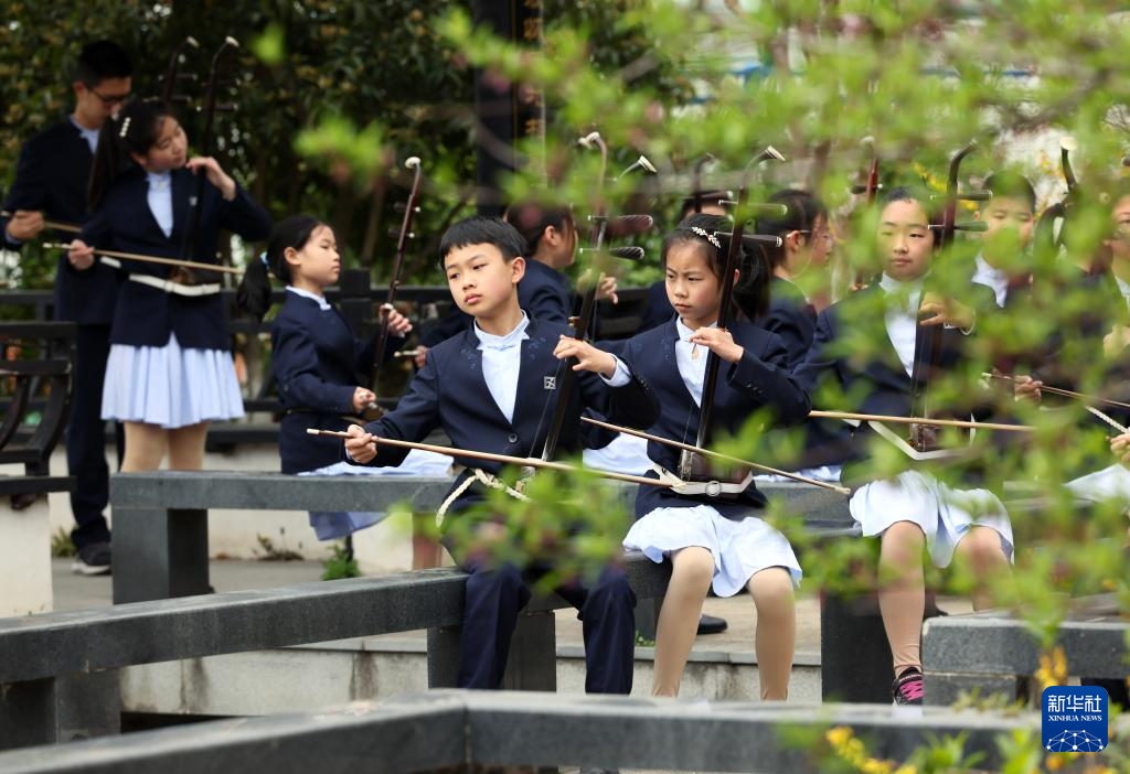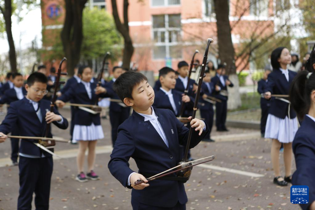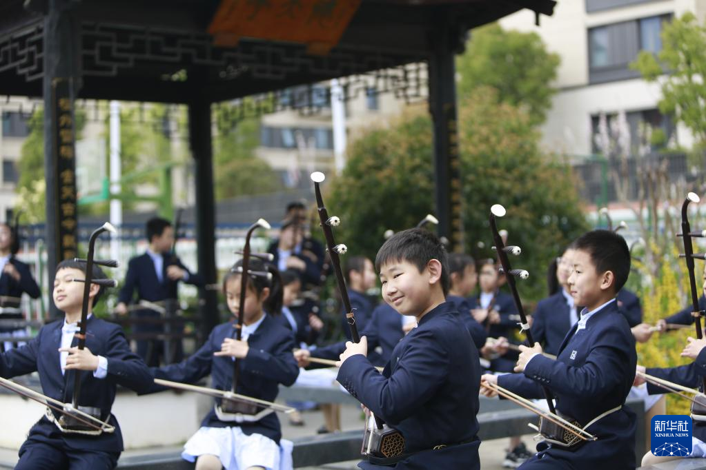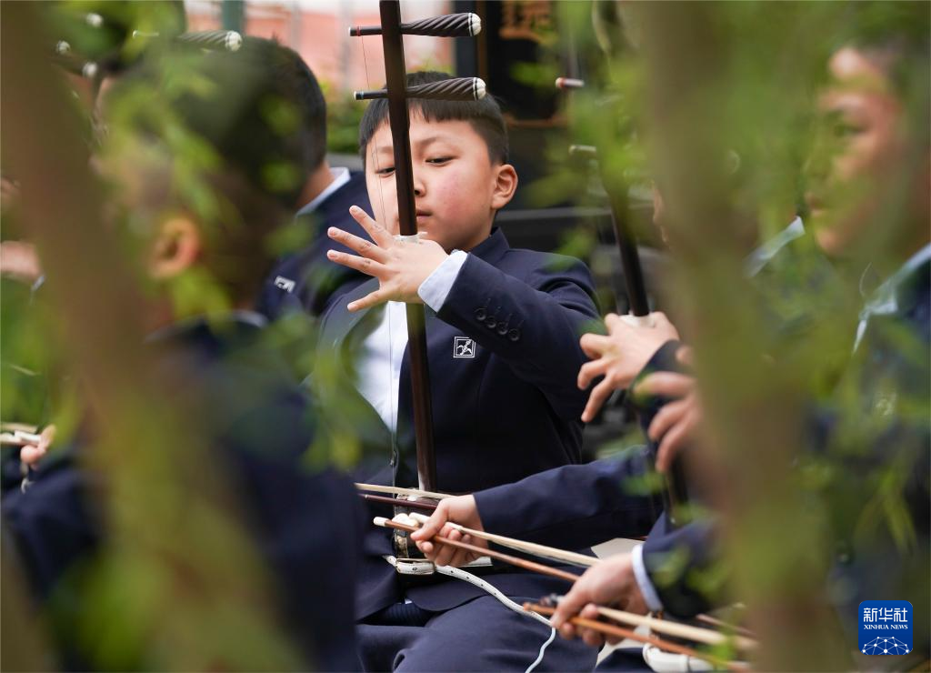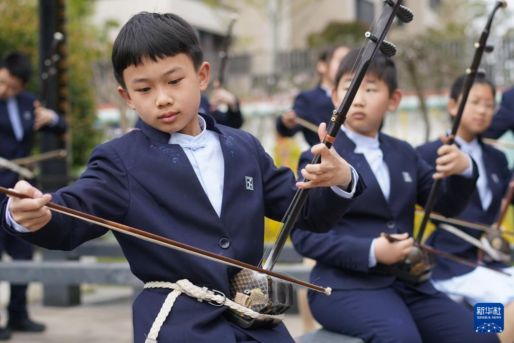 3月29日,江苏无锡梅村实验小学学生在演奏二胡。