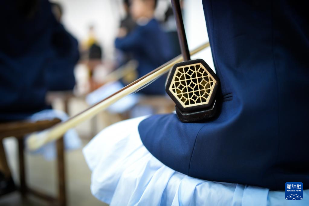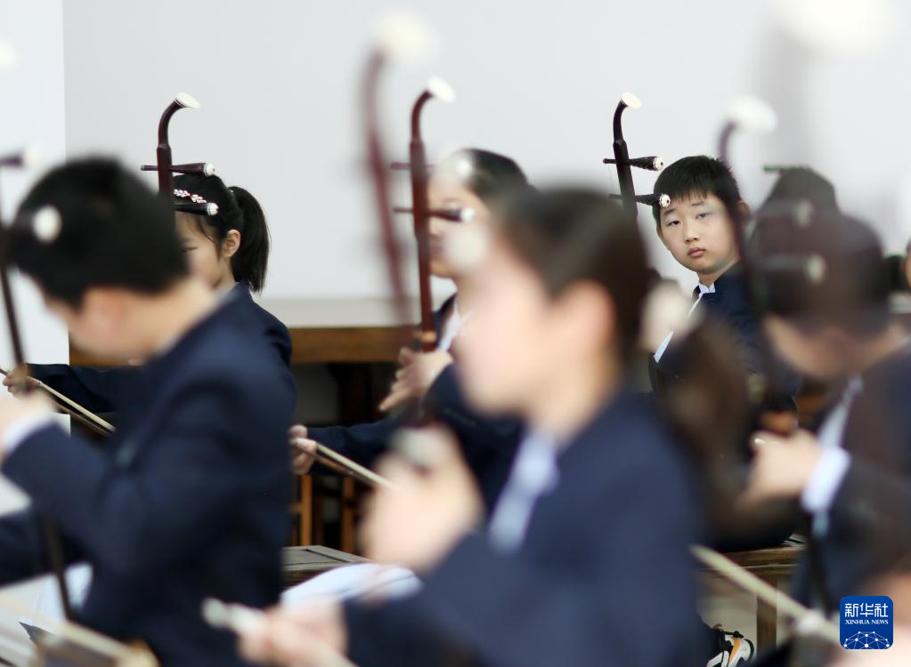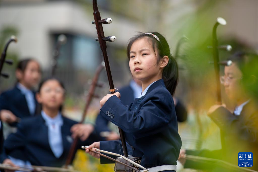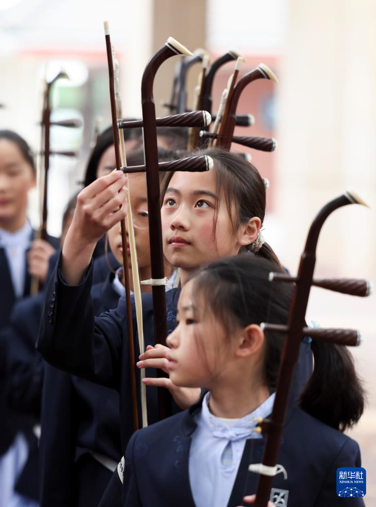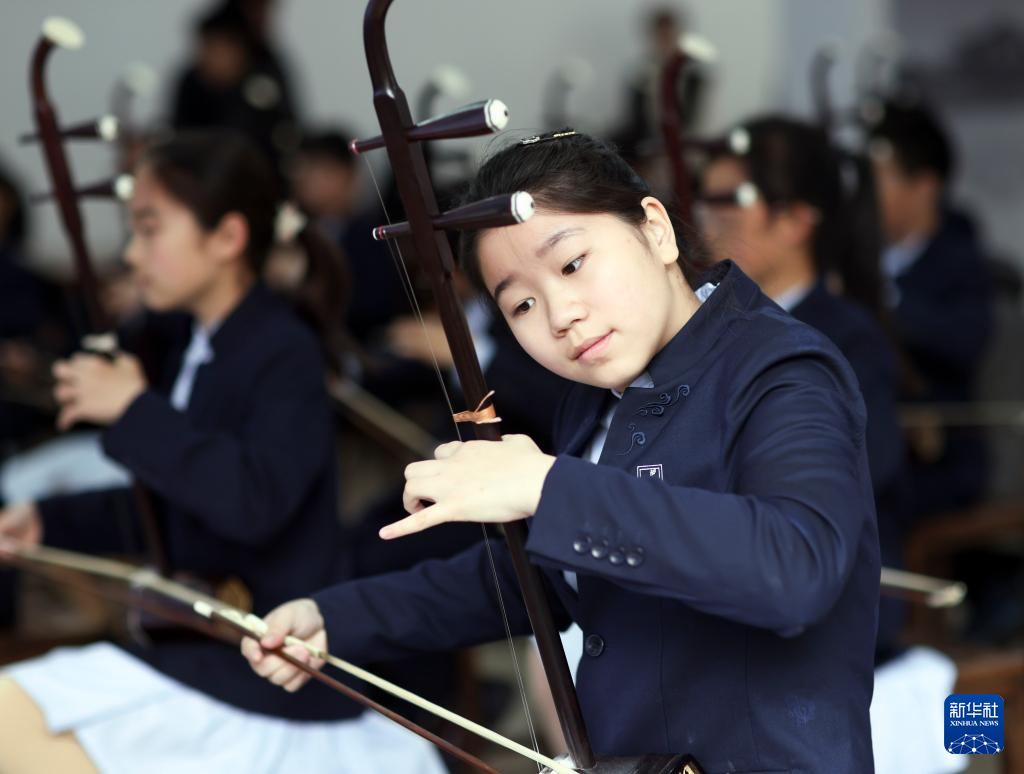 3月29日,江苏无锡梅村实验小学学生在演奏二胡。