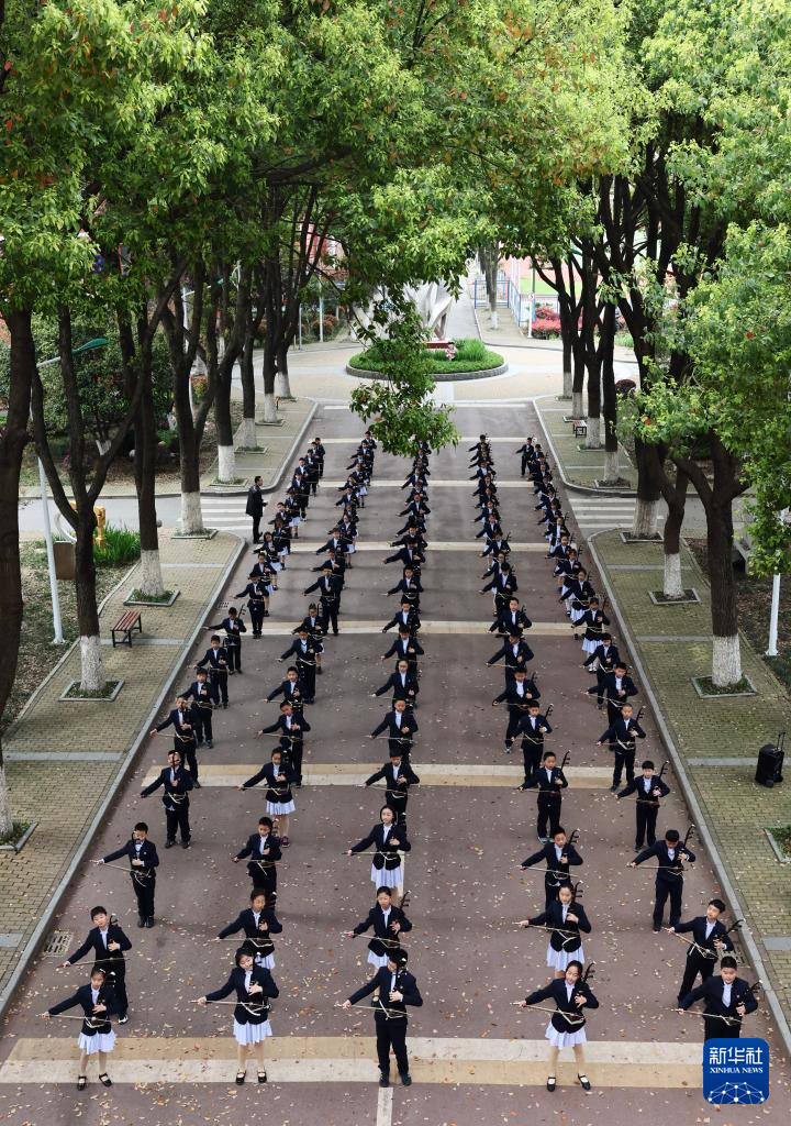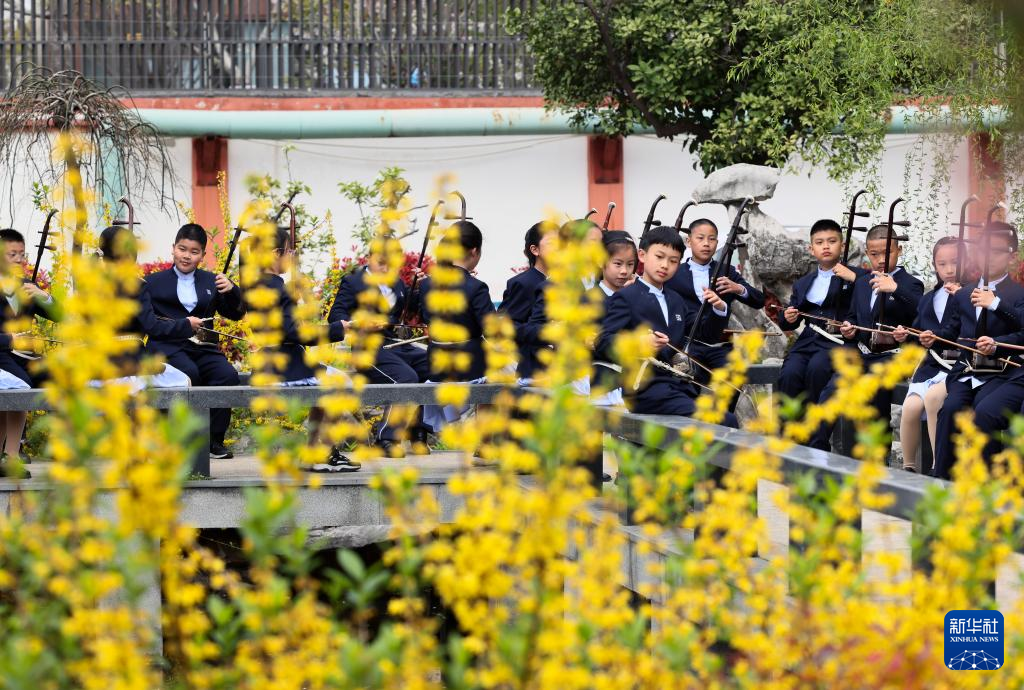 3月29日,江苏无锡梅村实验小学学生集体演奏二胡。