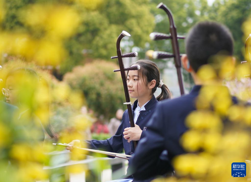3月29日,江苏无锡梅村实验小学二胡社团学生在户外演奏。