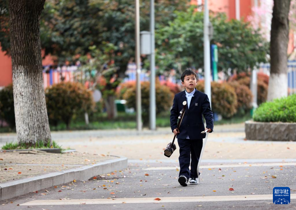 3月29日,在江苏无锡梅村实验小学,一名学生前去上二胡课。