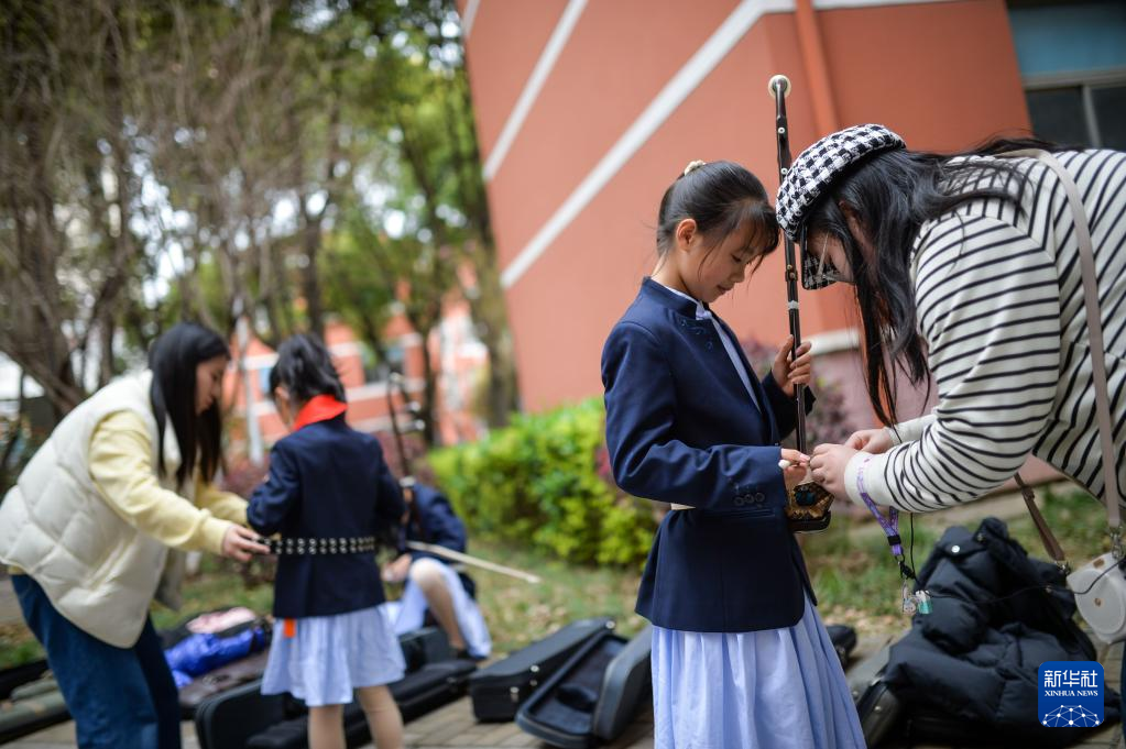 3月29日,在江苏无锡梅村实验小学,老师帮学生整理演奏二胡所需的腰带。