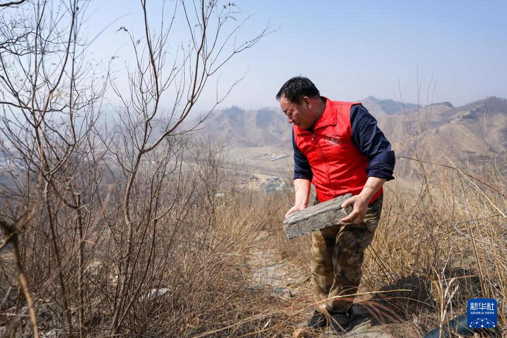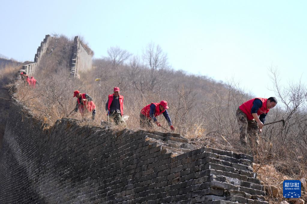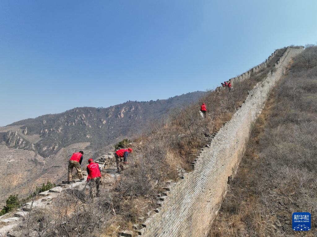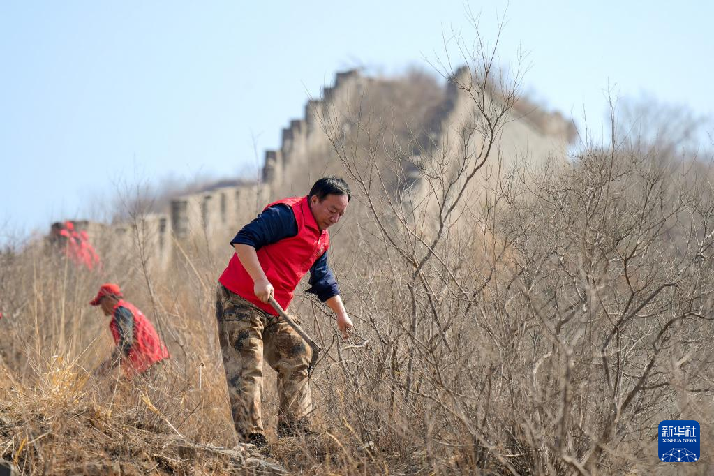 3月29日,“洪山口长城保护小分队”队员在长城上清理树枝。