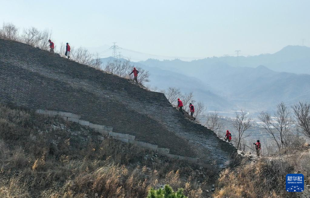 3月29日,“洪山口长城保护小分队”队员在长城上清理垃圾、树枝(无人机照片)。