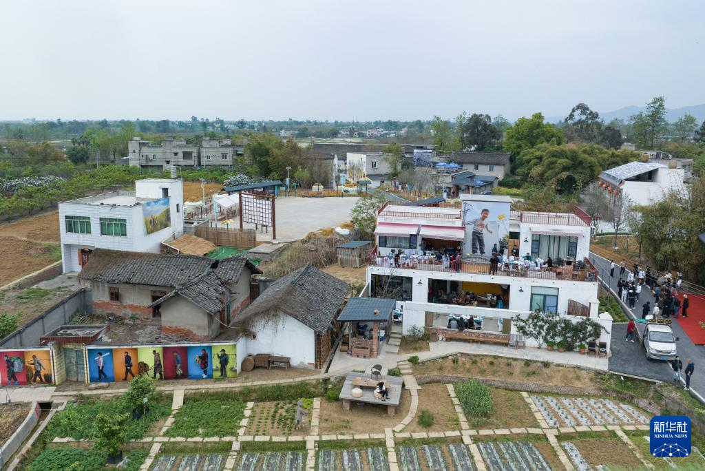 这是在宝胜村村屋墙壁上展出的影像艺术作品(4月1日摄,无人机照片)。