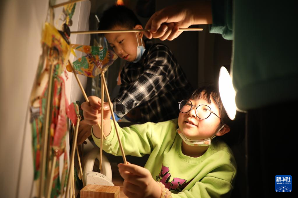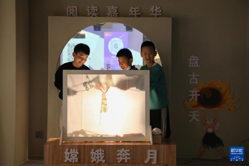 4月1日,在甘肃省兰州市的读者出版集团数字阅读中心读者小站,小朋友体验中国神话故事主题皮影戏。