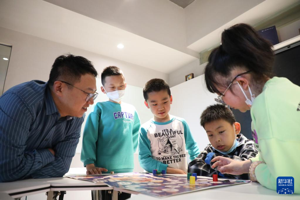 4月1日,在甘肃省兰州市的读者出版集团数字阅读中心读者小站,工作人员与小朋友一起玩“讲述中国神话故事”的飞行棋游戏。