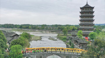 4月5日,在德清县新市古镇举行的蚕花庙会上,人们参加民俗巡游活动(无人机照片)。