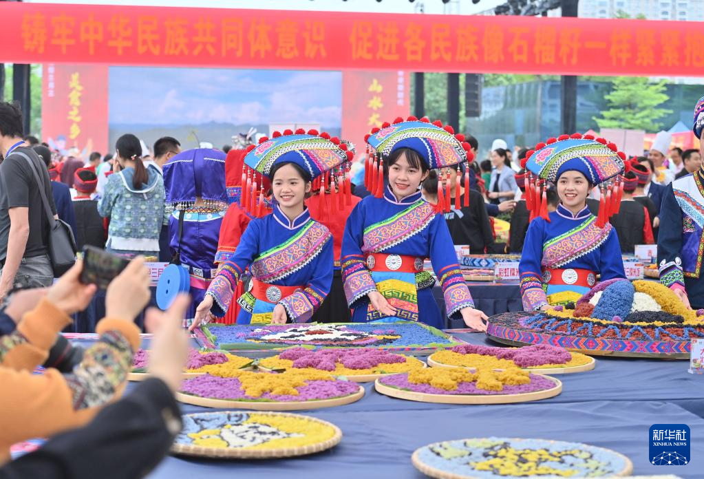 4月15日,参赛选手在广西河池市大化瑶族自治县江滨文化广场展示“五色糯米饭”参赛作品。