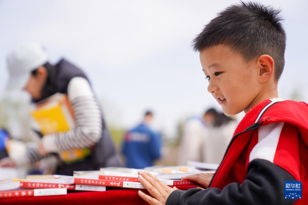 4月22日,一名小朋友在吉林省图书馆前的“换书大集”挑选图书。