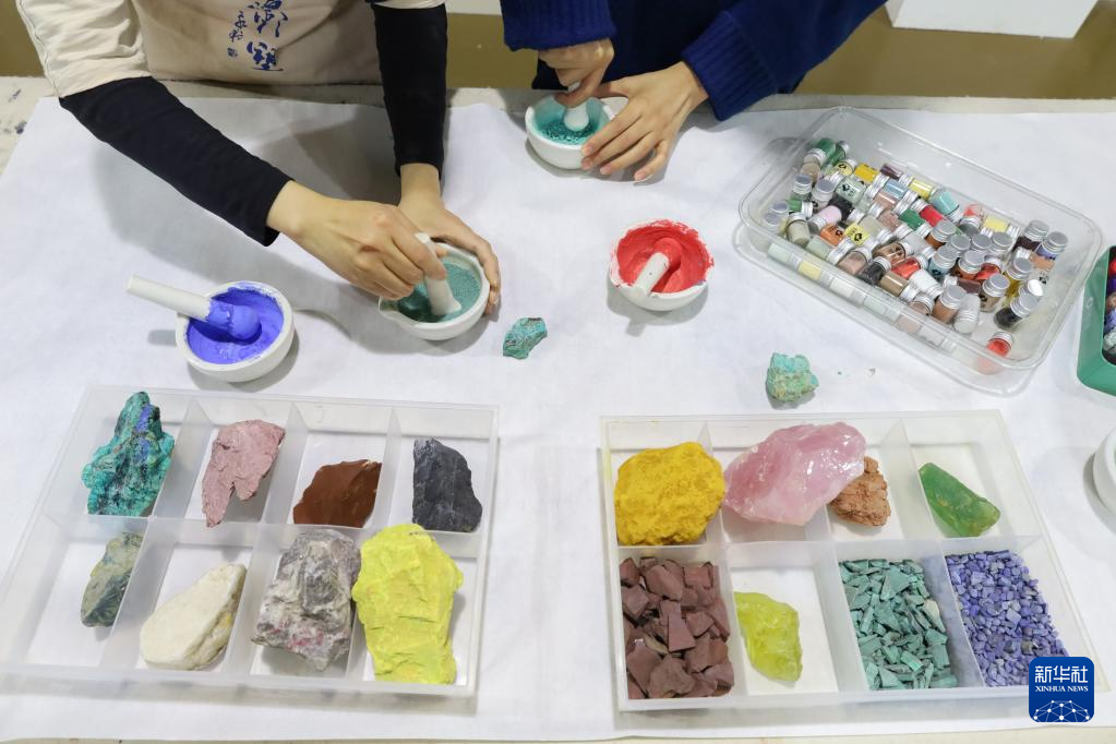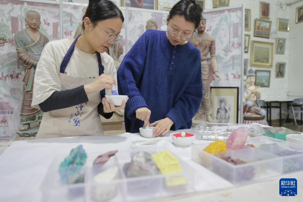 5月11日,学员在位于敦煌市的莫高里工匠村用天然矿石制成的颜料准备绘画。