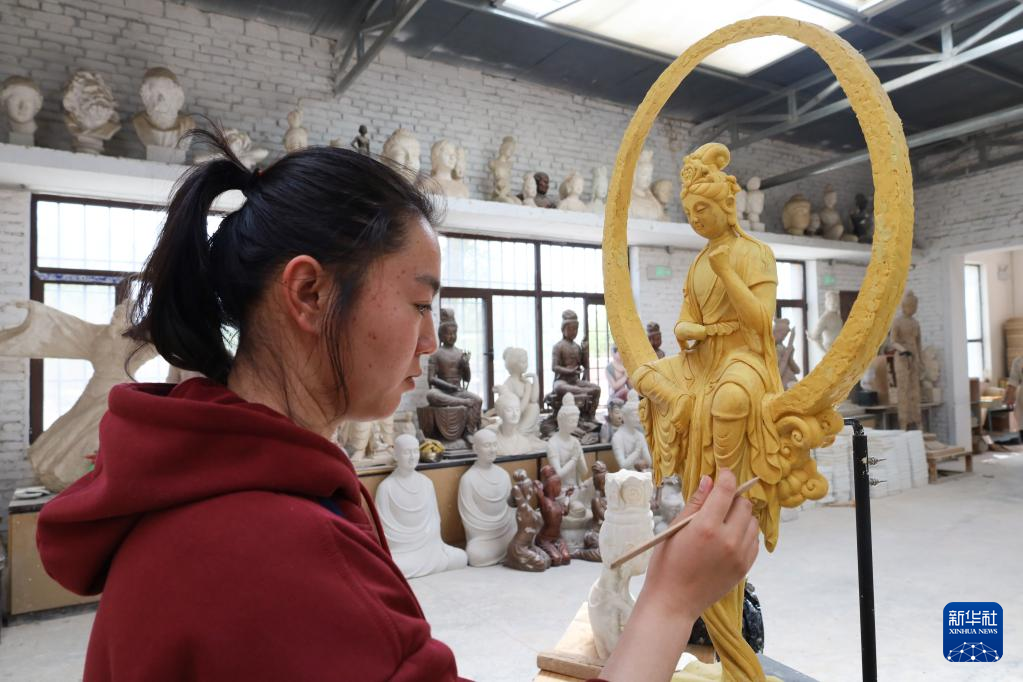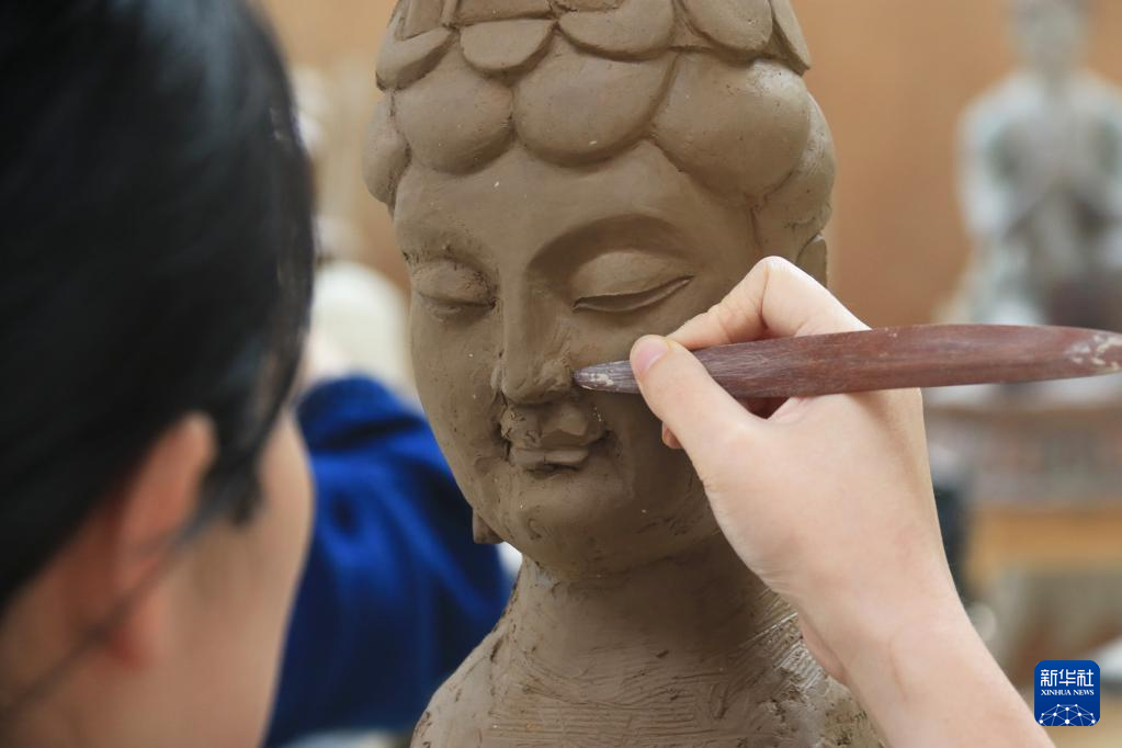 5月11日,学员在位于敦煌市的莫高里工匠村练习雕塑技艺。